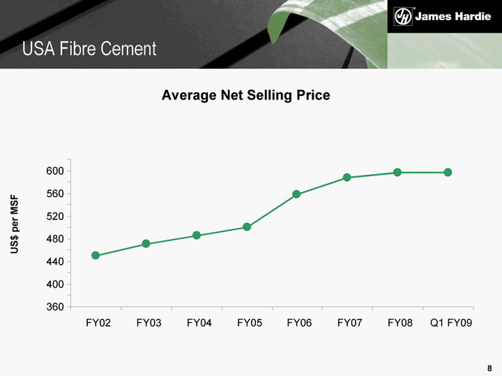 | Average Net Selling Price US$ per MSF 360 400 440 480 520 560 600 FY02 FY03 FY04 FY05 FY06 FY07 FY08 Q1 FY09 USA Fibre Cement |