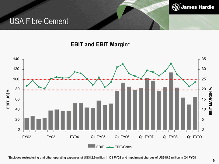 | *Excludes restructuring and other operating expenses of US$12.6 million in Q3 FY02 and impairment charges of US$45.6 million in Q4 FY08 EBIT and EBIT Margin* 0 20 40 60 80 100 120 140 FY02 FY03 FY04 Q1 FY05 Q1 FY06 Q1 FY07 Q1 FY08 Q1 FY09 EBIT US$M 0 5 10 15 20 25 30 35 EBIT MARGIN % EBIT EBIT/Sales USA Fibre Cement |