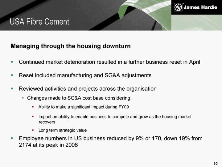 | Managing through the housing downturn Continued market deterioration resulted in a further business reset in April Reset included manufacturing and SG&A adjustments Reviewed activities and projects across the organisation Changes made to SG&A cost base considering: Ability to make a significant impact during FY09 Impact on ability to enable business to compete and grow as the housing market recovers Long term strategic value Employee numbers in US business reduced by 9% or 170, down 19% from 2174 at its peak in 2006 USA Fibre Cement |