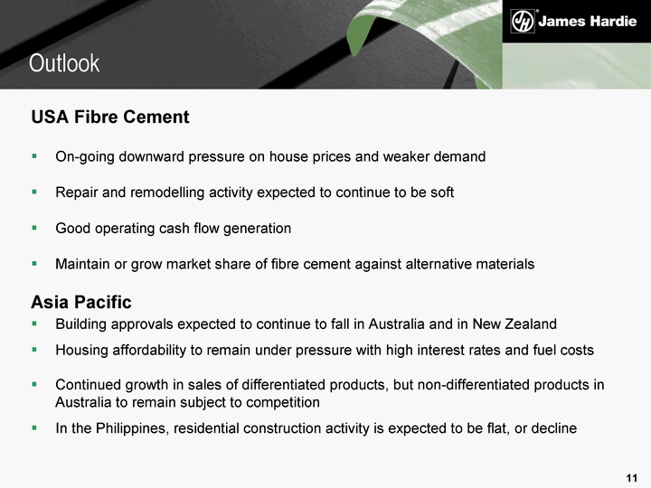 | USA Fibre Cement On-going downward pressure on house prices and weaker demand Repair and remodelling activity expected to continue to be soft Good operating cash flow generation Maintain or grow market share of fibre cement against alternative materials Asia Pacific Building approvals expected to continue to fall in Australia and in New Zealand Housing affordability to remain under pressure with high interest rates and fuel costs Continued growth in sales of differentiated products, but non-differentiated products in Australia to remain subject to competition In the Philippines, residential construction activity is expected to be flat, or decline Outlook |