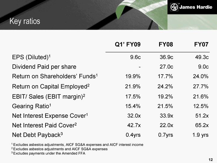 | Q1' FY09 FY08 FY07 EPS (Diluted)1 9.6c 36.9c 49.3c Dividend Paid per share - 27.0c 9.0c Return on Shareholders' Funds1 19.9% 17.7% 24.0% Return on Capital Employed2 21.9% 24.2% 27.7% EBIT/ Sales (EBIT margin)2 17.5% 19.2% 21.6% Gearing Ratio1 15.4% 21.5% 12.5% Net Interest Expense Cover1 32.0x 33.9x 51.2x Net Interest Paid Cover2 42.7x 22.0x 65.2x Net Debt Payback3 0.4yrs 0.7yrs 1.9 yrs 1 Excludes asbestos adjustments, AICF SG&A expenses and AICF interest income 2 Excludes asbestos adjustments and AICF SG&A expenses 3 Excludes payments under the Amended FFA Key ratios |