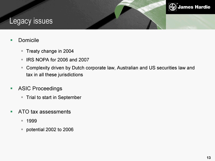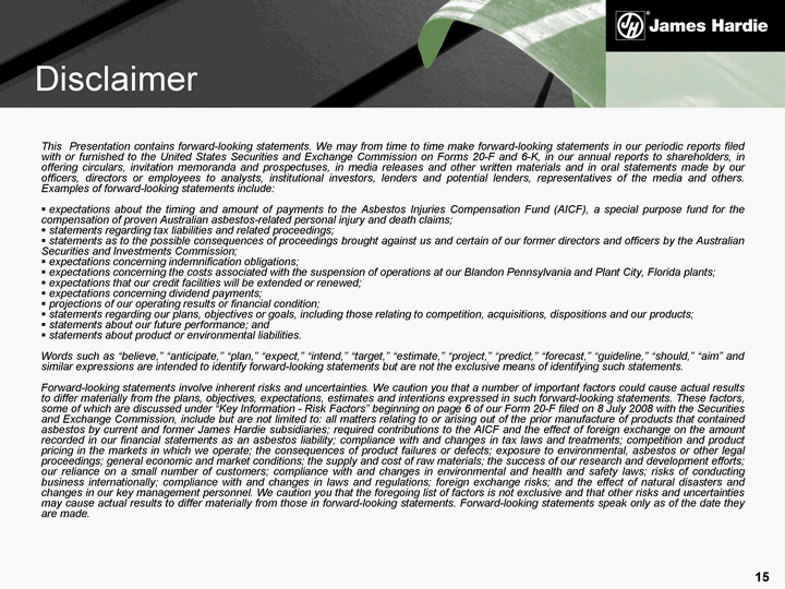 | This Presentation contains forward-looking statements. We may from time to time make forward-looking statements in our periodic reports filed with or furnished to the United States Securities and Exchange Commission on Forms 20-F and 6-K, in our annual reports to shareholders, in offering circulars, invitation memoranda and prospectuses, in media releases and other written materials and in oral statements made by our officers, directors or employees to analysts, institutional investors, lenders and potential lenders, representatives of the media and others. Examples of forward-looking statements include: expectations about the timing and amount of payments to the Asbestos Injuries Compensation Fund (AICF), a special purpose fund for the compensation of proven Australian asbestos-related personal injury and death claims; statements regarding tax liabilities and related proceedings; statements as to the possible consequences of proceedings brought against us and certain of our former directors and officers by the Australian Securities and Investments Commission; expectations concerning indemnification obligations; expectations concerning the costs associated with the suspension of operations at our Blandon Pennsylvania and Plant City, Florida plants; expectations that our credit facilities will be extended or renewed; expectations concerning dividend payments; projections of our operating results or financial condition; statements regarding our plans, objectives or goals, including those relating to competition, acquisitions, dispositions and our products; statements about our future performance; and statements about product or environmental liabilities. Words such as "believe," "anticipate," "plan," "expect," "intend," "target," "estimate," "project," "predict," "forecast," "guideline," "should," "aim" and similar expressions are intended to identify forward-looking statements but are not the exclusive means of identifying such statements. Forward-looking statements involve inherent risks and uncertainties. We caution you that a number of important factors could cause actual results to differ materially from the plans, objectives, expectations, estimates and intentions expressed in such forward-looking statements. These factors, some of which are discussed under "Key Information - Risk Factors" beginning on page 6 of our Form 20-F filed on 8 July 2008 with the Securities and Exchange Commission, include but are not limited to: all matters relating to or arising out of the prior manufacture of products that contained asbestos by current and former James Hardie subsidiaries; required contributions to the AICF and the effect of foreign exchange on the amount recorded in our financial statements as an asbestos liability; compliance with and changes in tax laws and treatments; competition and product pricing in the markets in which we operate; the consequences of product failures or defects; exposure to environmental, asbestos or other legal proceedings; general economic and market conditions; the supply and cost of raw materials; the success of our research and development efforts; our reliance on a small number of customers; compliance with and changes in environmental and health and safety laws; risks of conducting business internationally; compliance with and changes in laws and regulations; foreign exchange risks; and the effect of natural disasters and changes in our key management personnel. We caution you that the foregoing list of factors is not exclusive and that other risks and uncertainties may cause actual results to differ materially from those in forward-looking statements. Forward-looking statements speak only as of the date they are made. Disclaimer |