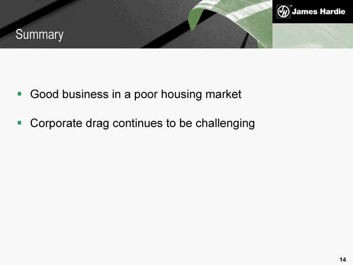 | Good business in a poor housing market Corporate drag continues to be challenging Summary |