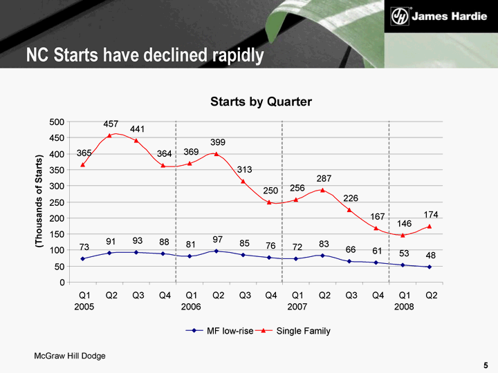| McGraw Hill Dodge NC Starts have declined rapidly Starts by Quarter 73 91 93 81 53 48 365 457 441 364 369 399 313 250 256 287 226 167 146 174 88 97 85 76 72 83 66 61 0 50 100 150 200 250 300 350 400 450 500 Q1 2005 Q2 Q3 Q4 Q1 2006 Q2 Q3 Q4 Q1 2007 Q2 Q3 Q4 Q1 2008 Q2 (Thousands of Starts) MF low-rise Single Family |