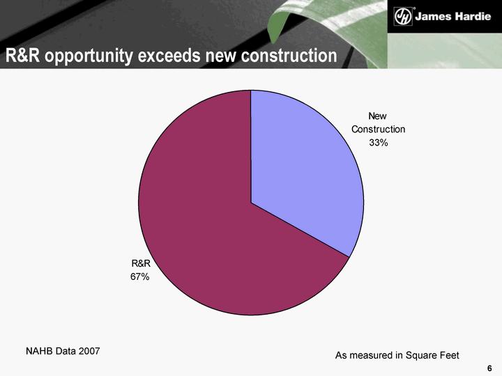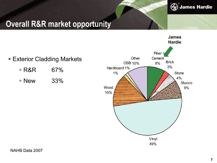 | NAHB Data 2007 James Hardie Exterior Cladding Markets R&R 67% New 33% Overall R&R market opportunity |
