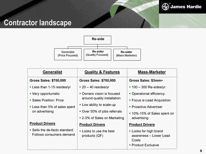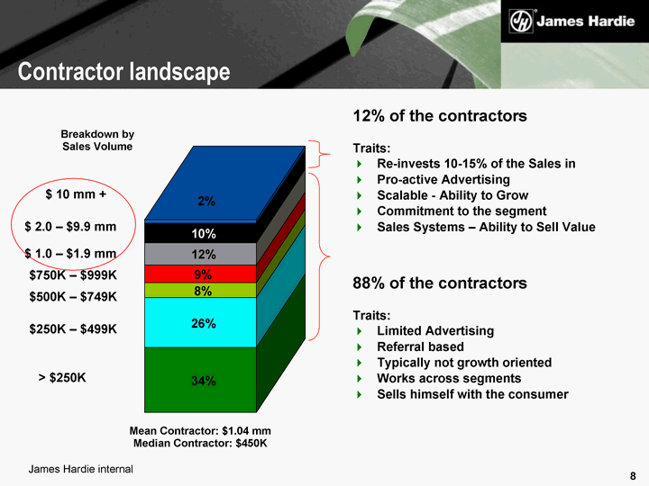 | $ 10 mm + $750K - $999K $500K - $749K $250K - $499K > $250K Breakdown by Sales Volume 12% of the contractors Traits: Re-invests 10-15% of the Sales in Pro-active Advertising Scalable - Ability to Grow Commitment to the segment Sales Systems - Ability to Sell Value Mean Contractor: $1.04 mm Median Contractor: $450K 88% of the contractors Traits: Limited Advertising Referral based Typically not growth oriented Works across segments Sells himself with the consumer $ 2.0 - $9.9 mm $ 1.0 - $1.9 mm James Hardie internal Contractor landscape 34% 26% 8% 9% 12% 10% 2% |