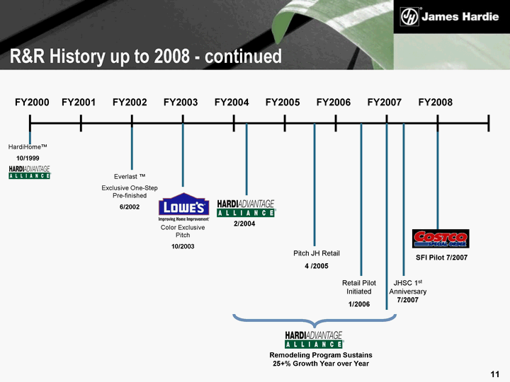 | FY2000 FY2008 FY2001 FY2003 FY2002 FY2004 FY2005 FY2006 FY2007 Everlast (tm) Exclusive One-Step Pre-finished 6/2002 Color Exclusive Pitch 10/2003 2/2004 Pitch JH Retail 4 /2005 Retail Pilot Initiated 1/2006 Remodeling Program Sustains 25+% Growth Year over Year JHSC 1st Anniversary 7/2007 SFI Pilot 7/2007 HardiHome(tm) 10/1999 R&R History up to 2008 - continued |