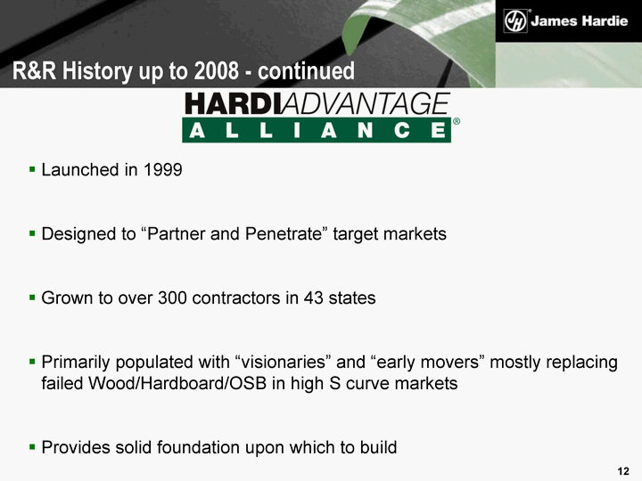 | Launched in 1999 Designed to "Partner and Penetrate" target markets Grown to over 300 contractors in 43 states Primarily populated with "visionaries" and "early movers" mostly replacing failed Wood/Hardboard/OSB in high S curve markets Provides solid foundation upon which to build R&R History up to 2008 - continued |