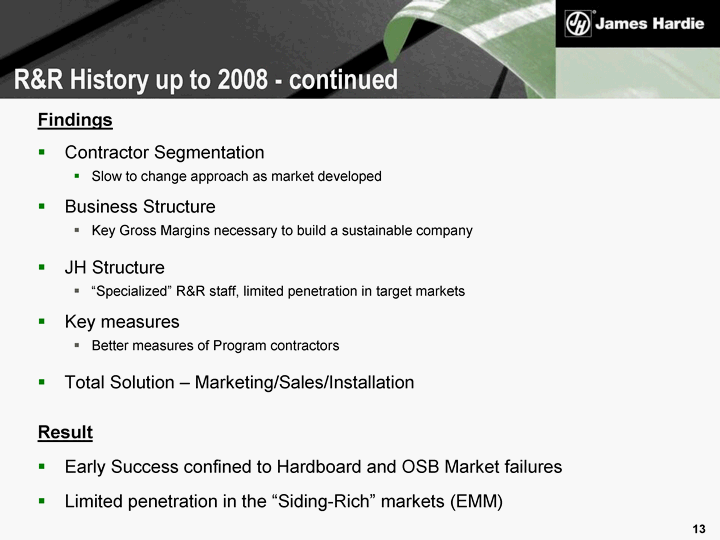 | Findings Contractor Segmentation Slow to change approach as market developed Business Structure Key Gross Margins necessary to build a sustainable company JH Structure "Specialized" R&R staff, limited penetration in target markets Key measures Better measures of Program contractors Total Solution - Marketing/Sales/Installation Result Early Success confined to Hardboard and OSB Market failures Limited penetration in the "Siding-Rich" markets (EMM) R&R History up to 2008 - continued |