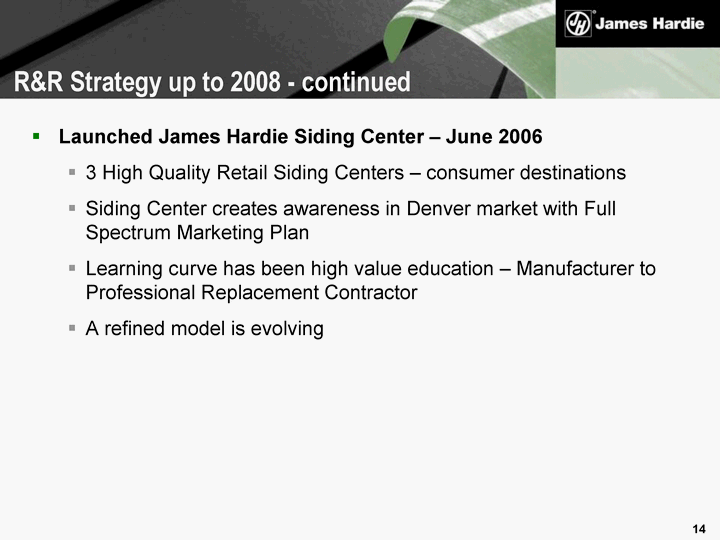 | Launched James Hardie Siding Center - June 2006 3 High Quality Retail Siding Centers - consumer destinations Siding Center creates awareness in Denver market with Full Spectrum Marketing Plan Learning curve has been high value education - Manufacturer to Professional Replacement Contractor A refined model is evolving R&R Strategy up to 2008 - continued |