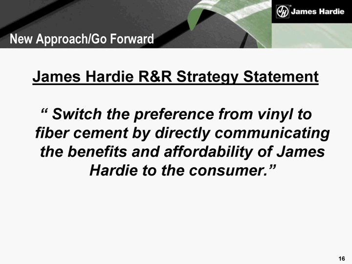 | James Hardie R&R Strategy Statement " Switch the preference from vinyl to fiber cement by directly communicating the benefits and affordability of James Hardie to the consumer." New Approach/Go Forward |