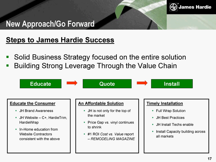 | Educate Quote Install An Affordable Solution JH is not only for the top of the market Price Gap vs. vinyl continues to shrink #1 ROI Cost vs. Value report - - REMODELING MAGAZINE Timely Installation Full Wrap Solution JH Best Practices JH Install Techs enable Install Capacity building across all markets Educate the Consumer JH Brand Awareness JH Website - C+, HardieTrim, HardieWrap In-Home education from Website Contractors consistent with the above Steps to James Hardie Success Solid Business Strategy focused on the entire solution Building Strong Leverage Through the Value Chain New Approach/Go Forward |