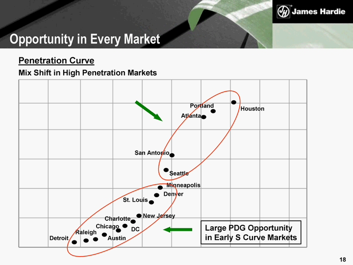| Penetration Curve Houston Portland Atlanta Seattle Raleigh San Antonio Charlotte St. Louis Minneapolis Detroit New Jersey Austin Chicago Denver DC Mix Shift in High Penetration Markets Large PDG Opportunity in Early S Curve Markets Opportunity in Every Market |