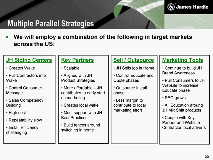 | We will employ a combination of the following in target markets across the US: JH Siding Centers Creates Wake Pull Contractors into Wake Control Consumer Message Sales Competency Building High cost Repeatability slow Install Efficiency challenging Key Partners Scalable Aligned with JH Product Strategies More affordable - JH contributes to early start up marketing Creates local wake Must support with JH Best Practices Build fences around switching in home Sell / Outsource JH Sells job in Home Control Educate and Quote phases Outsource Install phase Less margin to contribute to local marketing effort Marketing Tools Continue to build JH Brand Awareness Pull Consumers to JH Website to increase Educate phase SEO grows All Education around JH Mix Shift products Couple with Key Partner and Website Contractor local adverts Multiple Parallel Strategies |