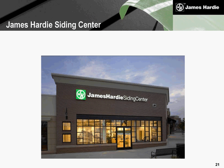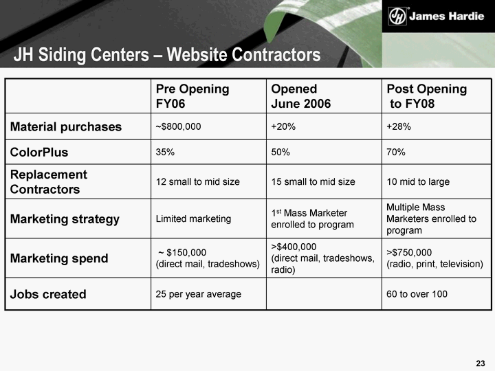 | Pre Opening FY06 Opened June 2006 Post Opening to FY08 Material purchases ~$800,000 +20% +28% ColorPlus 35% 50% 70% Replacement Contractors 12 small to mid size 15 small to mid size 10 mid to large Marketing strategy Limited marketing 1st Mass Marketer enrolled to program Multiple Mass Marketers enrolled to program Marketing spend ~ $150,000 (direct mail, tradeshows) >$400,000 (direct mail, tradeshows, radio) >$750,000 (radio, print, television) Jobs created 25 per year average 60 to over 100 JH Siding Centers - Website Contractors |