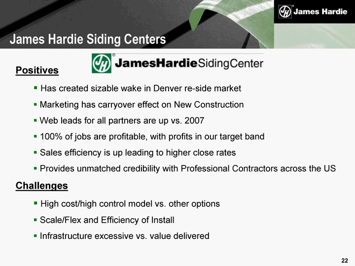 | Positives Has created sizable wake in Denver re-side market Marketing has carryover effect on New Construction Web leads for all partners are up vs. 2007 100% of jobs are profitable, with profits in our target band Sales efficiency is up leading to higher close rates Provides unmatched credibility with Professional Contractors across the US Challenges High cost/high control model vs. other options Scale/Flex and Efficiency of Install Infrastructure excessive vs. value delivered James Hardie Siding Centers |