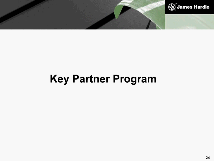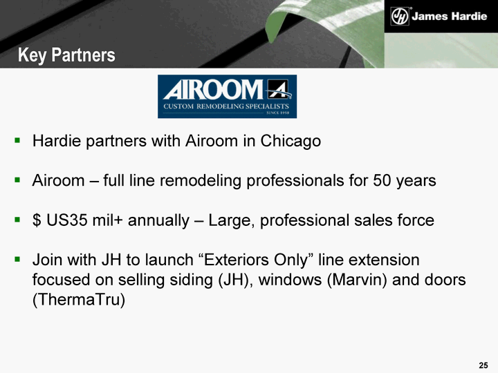 | Hardie partners with Airoom in Chicago Airoom - full line remodeling professionals for 50 years $ US35 mil+ annually - Large, professional sales force Join with JH to launch "Exteriors Only" line extension focused on selling siding (JH), windows (Marvin) and doors (ThermaTru) Key Partners |