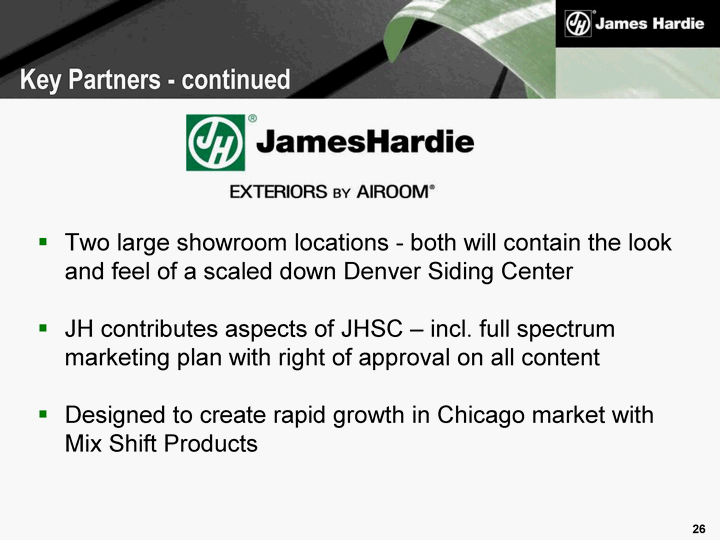 | Two large showroom locations - both will contain the look and feel of a scaled down Denver Siding Center JH contributes aspects of JHSC - incl. full spectrum marketing plan with right of approval on all content Designed to create rapid growth in Chicago market with Mix Shift Products Key Partners - continued |
