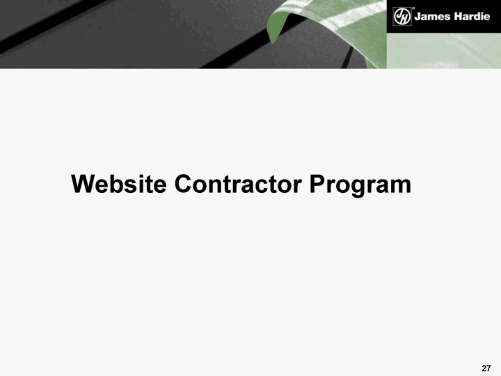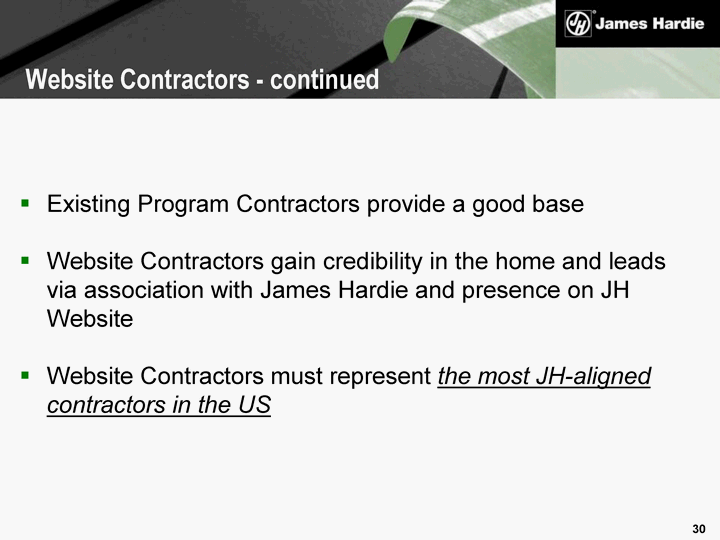 | Existing Program Contractors provide a good base Website Contractors gain credibility in the home and leads via association with James Hardie and presence on JH Website Website Contractors must represent the most JH-aligned contractors in the US Website Contractors - continued |