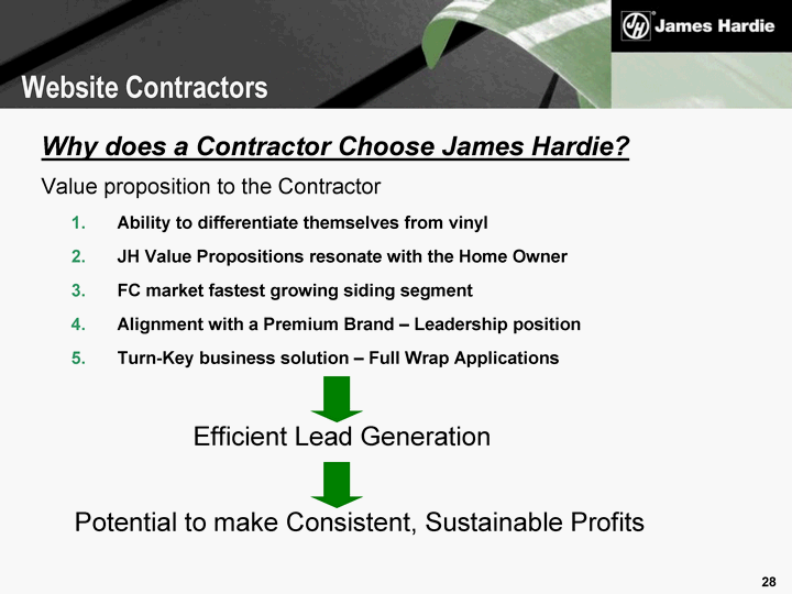 | Why does a Contractor Choose James Hardie? Value proposition to the Contractor Ability to differentiate themselves from vinyl JH Value Propositions resonate with the Home Owner FC market fastest growing siding segment Alignment with a Premium Brand - Leadership position Turn-Key business solution - Full Wrap Applications Efficient Lead Generation Potential to make Consistent, Sustainable Profits Website Contractors |
