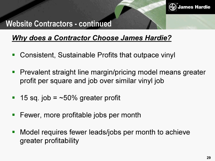 | Why does a Contractor Choose James Hardie? Consistent, Sustainable Profits that outpace vinyl Prevalent straight line margin/pricing model means greater profit per square and job over similar vinyl job 15 sq. job = ~50% greater profit Fewer, more profitable jobs per month Model requires fewer leads/jobs per month to achieve greater profitability Website Contractors - continued |