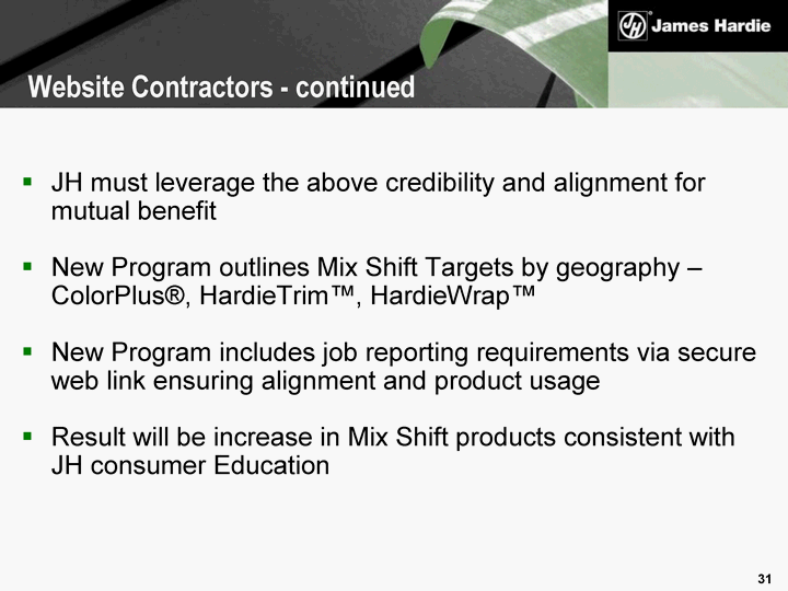 | JH must leverage the above credibility and alignment for mutual benefit New Program outlines Mix Shift Targets by geography - ColorPlus(r), HardieTrim(tm), HardieWrap(tm) New Program includes job reporting requirements via secure web link ensuring alignment and product usage Result will be increase in Mix Shift products consistent with JH consumer Education Website Contractors - continued |