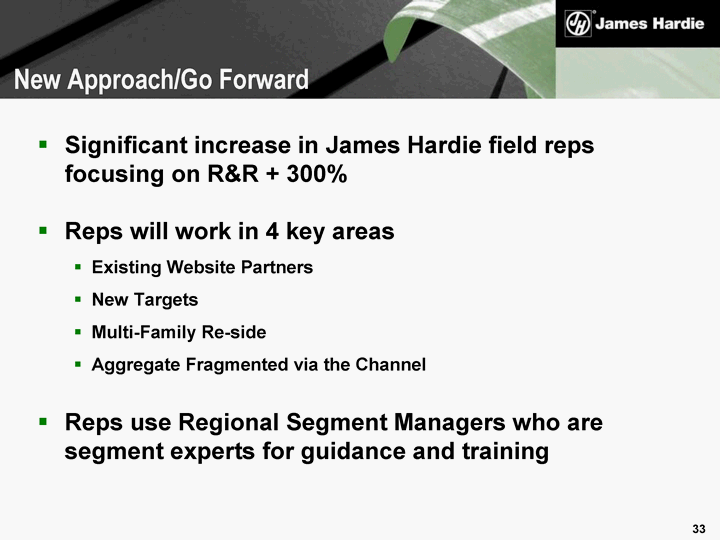| Significant increase in James Hardie field reps focusing on R&R + 300% Reps will work in 4 key areas Existing Website Partners New Targets Multi-Family Re-side Aggregate Fragmented via the Channel Reps use Regional Segment Managers who are segment experts for guidance and training New Approach/Go Forward |