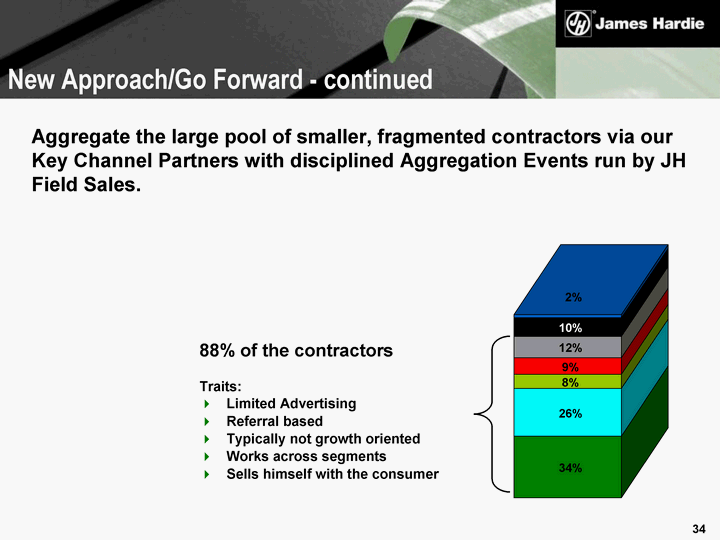 | Aggregate the large pool of smaller, fragmented contractors via our Key Channel Partners with disciplined Aggregation Events run by JH Field Sales. 88% of the contractors Traits: Limited Advertising Referral based Typically not growth oriented Works across segments Sells himself with the consumer New Approach/Go Forward - continued 34% 26% 8% 9% 12% 10% 2% |