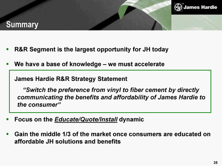 | R&R Segment is the largest opportunity for JH today We have a base of knowledge - we must accelerate James Hardie R&R Strategy Statement "Switch the preference from vinyl to fiber cement by directly communicating the benefits and affordability of James Hardie to the consumer" Focus on the Educate/Quote/Install dynamic Gain the middle 1/3 of the market once consumers are educated on affordable JH solutions and benefits Summary |