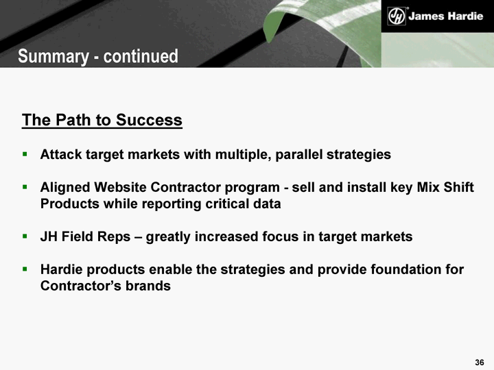 | The Path to Success Attack target markets with multiple, parallel strategies Aligned Website Contractor program - sell and install key Mix Shift Products while reporting critical data JH Field Reps - greatly increased focus in target markets Hardie products enable the strategies and provide foundation for Contractor's brands Summary - continued |