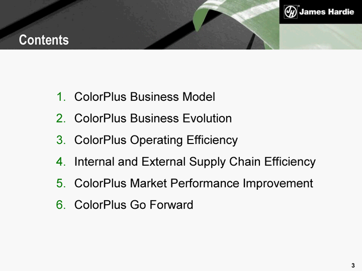 | ColorPlus Business Model ColorPlus Business Evolution ColorPlus Operating Efficiency Internal and External Supply Chain Efficiency ColorPlus Market Performance Improvement ColorPlus Go Forward Contents |