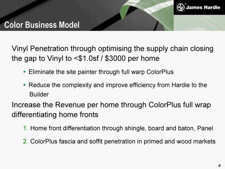 | Vinyl Penetration through optimising the supply chain closing the gap to Vinyl to <$1.0sf / $3000 per home Eliminate the site painter through full warp ColorPlus Reduce the complexity and improve efficiency from Hardie to the Builder Increase the Revenue per home through ColorPlus full wrap differentiating home fronts Home front differentiation through shingle, board and baton, Panel ColorPlus fascia and soffit penetration in primed and wood markets Color Business Model |