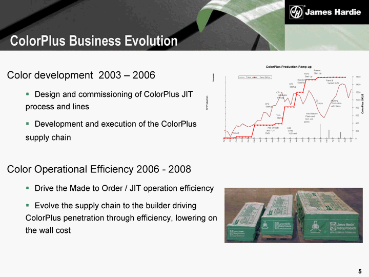 | Color development 2003 - 2006 Design and commissioning of ColorPlus JIT process and lines Development and execution of the ColorPlus supply chain Color Operational Efficiency 2006 - 2008 Drive the Made to Order / JIT operation efficiency Evolve the supply chain to the builder driving ColorPlus penetration through efficiency, lowering on the wall cost ColorPlus Business Evolution ColorPlus Production Ramp-up 0 2,000 4,000 6,000 8,000 10,000 12,000 14,000 16,000 18,000 20,000 Apr-04 Jun-04 Aug-04 Oct-04 Dec-04 Feb-05 Apr-05 Jun-05 Aug-05 Oct-05 Dec-05 Feb-06 Apr-06 Jun-06 Aug-06 Oct-06 Dec-06 Feb-07 Apr-07 Jun-07 Aug-07 Oct-07 Thousands SF Production 0 200 400 600 800 1000 1200 1400 1600 ColorPlus SKUS Total Peru SKUs Product CP1 Laminator Retrofit Add Smooth and 7.25 CMS Add Beaded Plank and XLD Job packs Add Soffit, XLD and CP2 Startup CP3 Startup 20 Colors Trim Startup Aligning Production with Sales Reno Start Up Blandon Start Up Pulaski Start Up Panel & Vented Soffit |