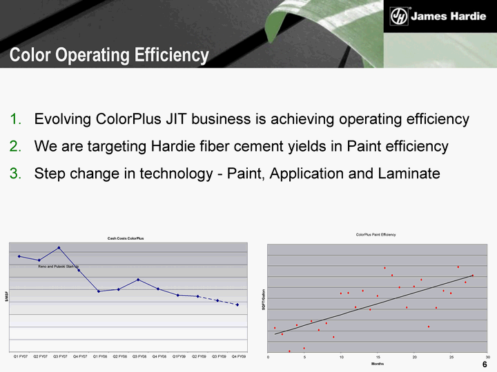 | Evolving ColorPlus JIT business is achieving operating efficiency We are targeting Hardie fiber cement yields in Paint efficiency Step change in technology - Paint, Application and Laminate Color Operating Efficiency Cash Costs ColorPlus Q1 FY07 Q2 FY07 Q3 FY07 Q4 FY07 Q1 FY08 Q2 FY08 Q3 FY08 Q4 FY08 Q1FY09 Q2 FY09 Q3 FY09 Q4 FY09 $/MSF Reno and Pulaski Start-Up ColorPlus Paint Efficiency 0 5 10 15 20 25 30 Months SQFT/Gallon |