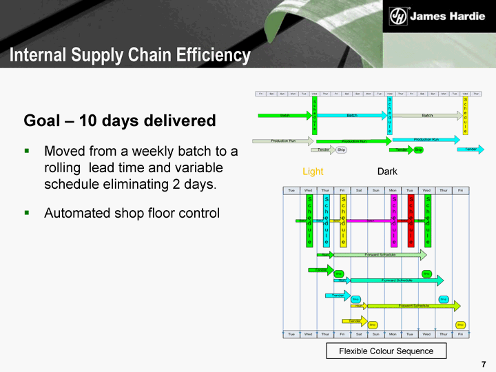| Goal - 10 days delivered Moved from a weekly batch to a rolling lead time and variable schedule eliminating 2 days. Automated shop floor control Light Dark Flexible Colour Sequence Internal Supply Chain Efficiency |