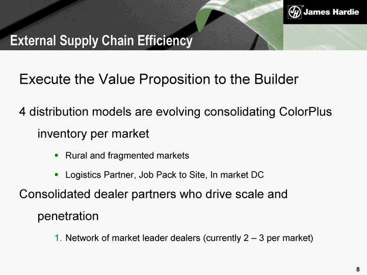 | Execute the Value Proposition to the Builder 4 distribution models are evolving consolidating ColorPlus inventory per market Rural and fragmented markets Logistics Partner, Job Pack to Site, In market DC Consolidated dealer partners who drive scale and penetration Network of market leader dealers (currently 2 - 3 per market) External Supply Chain Efficiency |