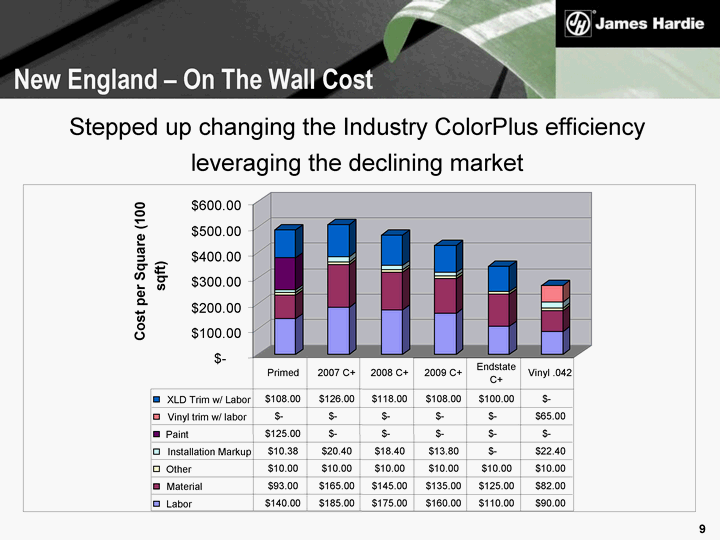 | Stepped up changing the Industry ColorPlus efficiency leveraging the declining market New England - On The Wall Cost $- $100.00 $200.00 $300.00 $400.00 $500.00 $600.00 Cost per Square (100 sqft) XLD Trim w/ Labor $108.00 $126.00 $118.00 $108.00 $100.00 $- Vinyl trim w/ labor $- $- $- $- $- $65.00 Paint $125.00 $- $- $- $- $- Installation Markup $10.38 $20.40 $18.40 $13.80 $- $22.40 Other $10.00 $10.00 $10.00 $10.00 $10.00 $10.00 Material $93.00 $165.00 $145.00 $135.00 $125.00 $82.00 Labor $140.00 $185.00 $175.00 $160.00 $110.00 $90.00 Primed 2007 C+ 2008 C+ 2009 C+ Endstate C+ Vinyl .042 |