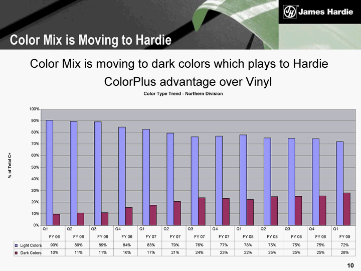 | Color Mix is moving to dark colors which plays to Hardie ColorPlus advantage over Vinyl Color Mix is Moving to Hardie Color Type Trend - Northern Division 0% 10% 20% 30% 40% 50% 60% 70% 80% 90% 100% % of Total C+ Light Colors 90% 89% 89% 84% 83% 79% 76% 77% 78% 75% 75% 75% 72% Dark Colors 10% 11% 11% 16% 17% 21% 24% 23% 22% 25% 25% 25% 28% Q1 Q2 Q3 Q4 Q1 Q2 Q3 Q4 Q1 Q2 Q3 Q4 Q1 FY 06 FY 06 FY 06 FY 06 FY 07 FY 07 FY 07 FY 07 FY 08 FY 08 FY 08 FY 08 FY 09 |