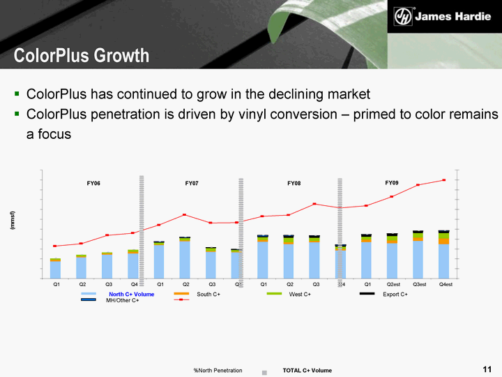 | ColorPlus has continued to grow in the declining market ColorPlus penetration is driven by vinyl conversion - primed to color remains a focus ColorPlus Growth - - 10 20 30 40 50 60 70 80 90 100 110 Q1 Q2 Q3 Q4 Q1 Q2 Q3 Q4 Q1 Q2 Q3 Q4 Q1 Q2est Q3est Q4est (mmsf) 0% 5% 10% 15% 20% 25% 30% 35% 40% 45% 50% 55% North C+ Volume South C+ West C+ Export C+ MH/Other C+ %North Penetration TOTAL C+ Volume FY06 FY09 FY08 FY07 |