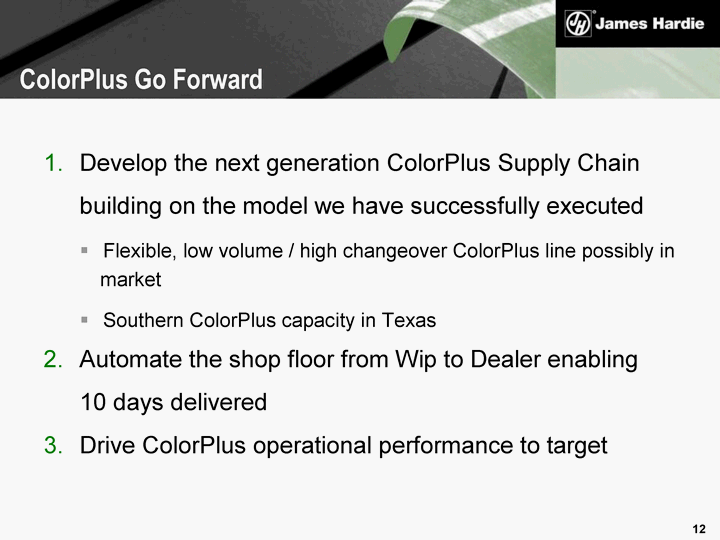 | Develop the next generation ColorPlus Supply Chain building on the model we have successfully executed Flexible, low volume / high changeover ColorPlus line possibly in market Southern ColorPlus capacity in Texas Automate the shop floor from Wip to Dealer enabling 10 days delivered Drive ColorPlus operational performance to target ColorPlus Go Forward |