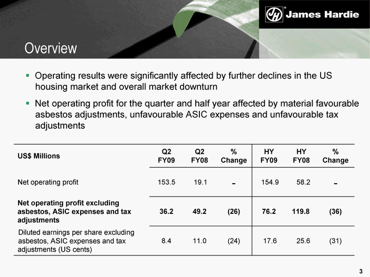 | Operating results were significantly affected by further declines in the US housing market and overall market downturn Net operating profit for the quarter and half year affected by material favourable asbestos adjustments, unfavourable ASIC expenses and unfavourable tax adjustments US$ Millions Q2 FY09 Q2 FY08 % Change HY FY09 HY FY08 % Change Net operating profit 153.5 19.1 - 154.9 58.2 - Net operating profit excluding asbestos, ASIC expenses and tax adjustments 36.2 49.2 (26) 76.2 119.8 (36) Diluted earnings per share excluding asbestos, ASIC expenses and tax adjustments (US cents) 8.4 11.0 (24) 17.6 25.6 (31) Overview |