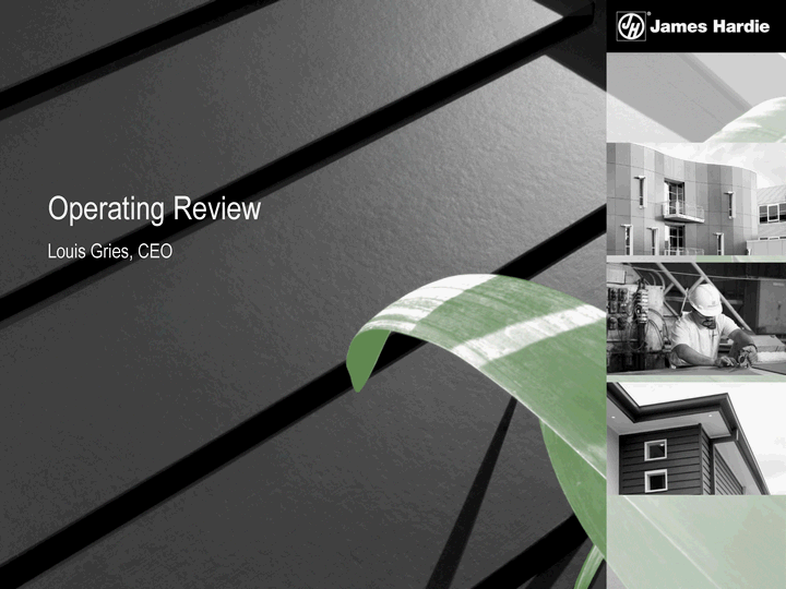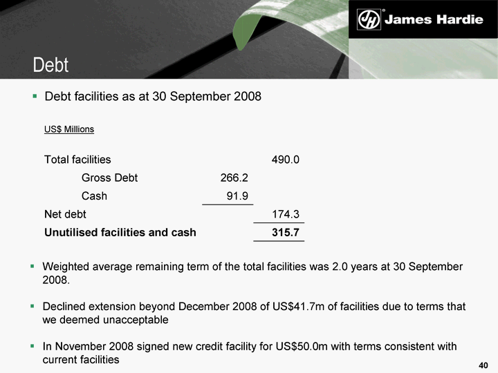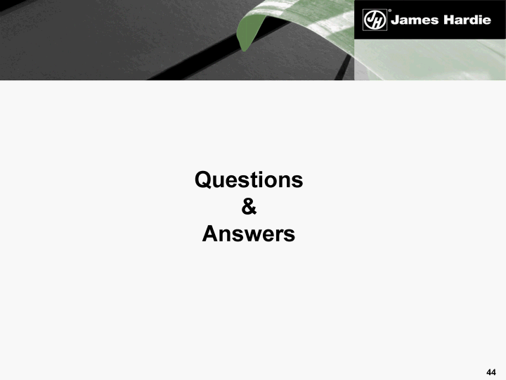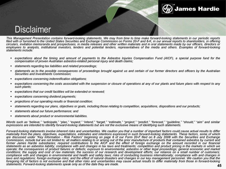 | This Management Presentation contains forward-looking statements. We may from time to time make forward-looking statements in our periodic reports filed with or furnished to the United States Securities and Exchange Commission on Forms 20-F and 6-K, in our annual reports to shareholders, in offering circulars, invitation memoranda and prospectuses, in media releases and other written materials and in oral statements made by our officers, directors or employees to analysts, institutional investors, lenders and potential lenders, representatives of the media and others. Examples of forward-looking statements include: expectations about the timing and amount of payments to the Asbestos Injuries Compensation Fund (AICF), a special purpose fund for the compensation of proven Australian asbestos-related personal injury and death claims; statements regarding tax liabilities and related proceedings; statements as to the possible consequences of proceedings brought against us and certain of our former directors and officers by the Australian Securities and Investments Commission; expectations concerning indemnification obligations; expectations concerning the costs associated with the suspension or closure of operations at any of our plants and future plans with respect to any such plants; expectations that our credit facilities will be extended or renewed; expectations concerning dividend payments; projections of our operating results or financial condition; statements regarding our plans, objectives or goals, including those relating to competition, acquisitions, dispositions and our products; statements about our future performance; and statements about product or environmental liabilities. Words such as "believe," "anticipate," "plan," "expect," "intend," "target," "estimate," "project," "predict," "forecast," "guideline," "should," "aim" and similar expressions are intended to identify forward-looking statements but are not the exclusive means of identifying such statements. Forward-looking statements involve inherent risks and uncertainties. We caution you that a number of important factors could cause actual results to differ materially from the plans, objectives, expectations, estimates and intentions expressed in such forward-looking statements. These factors, some of which are discussed under "Key Information - Risk Factors" beginning on page 6 of our Form 20-F filed on 8 July 2008 with the Securities and Exchange Commission, include but are not limited to: all matters relating to or arising out of the prior manufacture of products that contained asbestos by current and former James Hardie subsidiaries; required contributions to the AICF and the effect of foreign exchange on the amount recorded in our financial statements as an asbestos liability; compliance with and changes in tax laws and treatments; competition and product pricing in the markets in which we operate; the consequences of product failures or defects; exposure to environmental, asbestos or other legal proceedings; general economic and market conditions; the supply and cost of raw materials; the success of our research and development efforts; our reliance on a small number of customers; compliance with and changes in environmental and health and safety laws; risks of conducting business internationally; compliance with and changes in laws and regulations; foreign exchange risks; and the effect of natural disasters and changes in our key management personnel. We caution you that the foregoing list of factors is not exclusive and that other risks and uncertainties may cause actual results to differ materially from those in forward-looking statements. Forward-looking statements speak only as of the date they are made. Disclaimer |