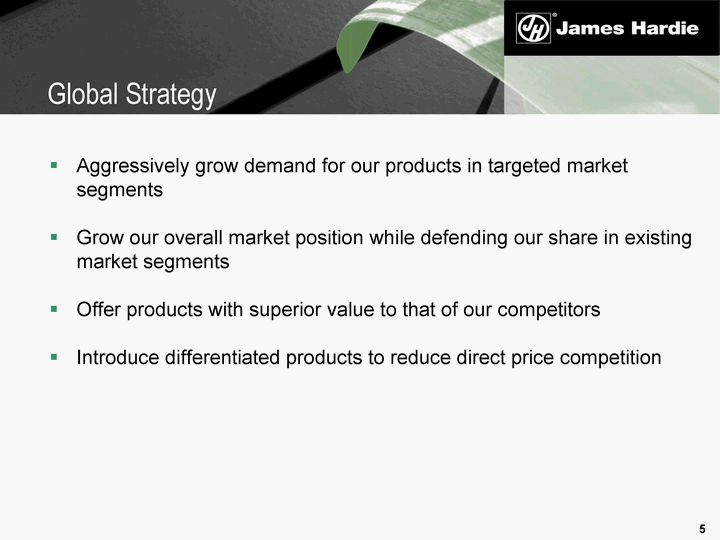 | Aggressively grow demand for our products in targeted market segments Grow our overall market position while defending our share in existing market segments Offer products with superior value to that of our competitors Introduce differentiated products to reduce direct price competition Global Strategy |
