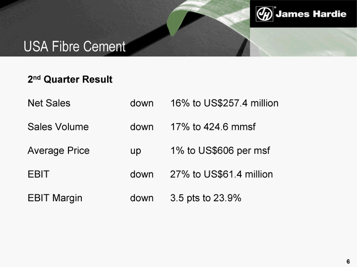 | 2nd Quarter Result Net Sales down 16% to US$257.4 million Sales Volume down 17% to 424.6 mmsf Average Price up 1% to US$606 per msf EBIT down 27% to US$61.4 million EBIT Margin down 3.5 pts to 23.9% USA Fibre Cement |