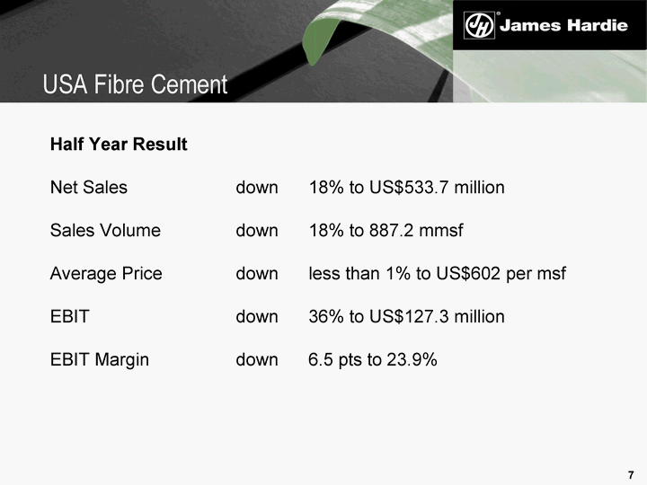 | Half Year Result Net Sales down 18% to US$533.7 million Sales Volume down 18% to 887.2 mmsf Average Price down less than 1% to US$602 per msf EBIT down 36% to US$127.3 million EBIT Margin down 6.5 pts to 23.9% USA Fibre Cement |