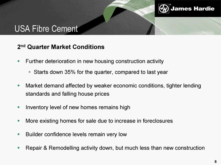 | 2nd Quarter Market Conditions Further deterioration in new housing construction activity Starts down 35% for the quarter, compared to last year Market demand affected by weaker economic conditions, tighter lending standards and falling house prices Inventory level of new homes remains high More existing homes for sale due to increase in foreclosures Builder confidence levels remain very low Repair & Remodelling activity down, but much less than new construction USA Fibre Cement |