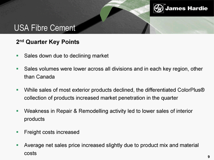 | 2nd Quarter Key Points Sales down due to declining market Sales volumes were lower across all divisions and in each key region, other than Canada While sales of most exterior products declined, the differentiated ColorPlus(r) collection of products increased market penetration in the quarter Weakness in Repair & Remodelling activity led to lower sales of interior products Freight costs increased Average net sales price increased slightly due to product mix and material costs USA Fibre Cement |