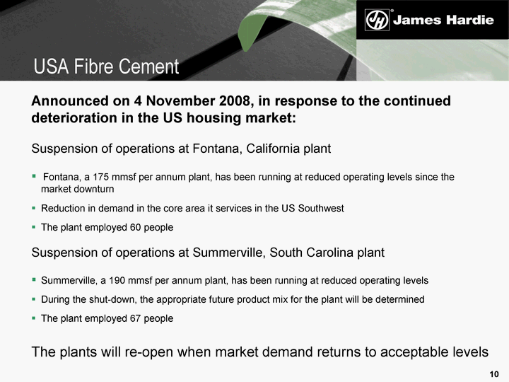 | Announced on 4 November 2008, in response to the continued deterioration in the US housing market: Suspension of operations at Fontana, California plant Fontana, a 175 mmsf per annum plant, has been running at reduced operating levels since the market downturn Reduction in demand in the core area it services in the US Southwest The plant employed 60 people Suspension of operations at Summerville, South Carolina plant Summerville, a 190 mmsf per annum plant, has been running at reduced operating levels During the shut-down, the appropriate future product mix for the plant will be determined The plant employed 67 people The plants will re-open when market demand returns to acceptable levels USA Fibre Cement |