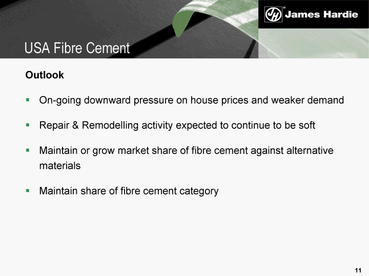 | Outlook On-going downward pressure on house prices and weaker demand Repair & Remodelling activity expected to continue to be soft Maintain or grow market share of fibre cement against alternative materials Maintain share of fibre cement category USA Fibre Cement |