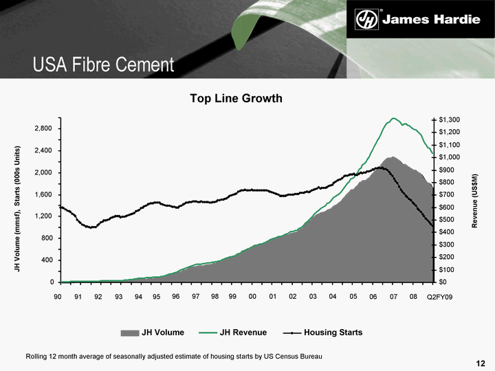 | Rolling 12 month average of seasonally adjusted estimate of housing starts by US Census Bureau Top Line Growth 0 400 800 1,200 1,600 2,000 2,400 2,800 90 91 92 93 94 95 96 97 98 99 00 01 02 03 04 05 06 07 08 JH Volume (mmsf), Starts (000s Units) $0 $100 $200 $300 $400 $500 $600 $700 $800 $900 $1,000 $1,100 $1,200 $1,300 Revenue (US$M) JH Volume JH Revenue Housing Starts Q2FY09 USA Fibre Cement |